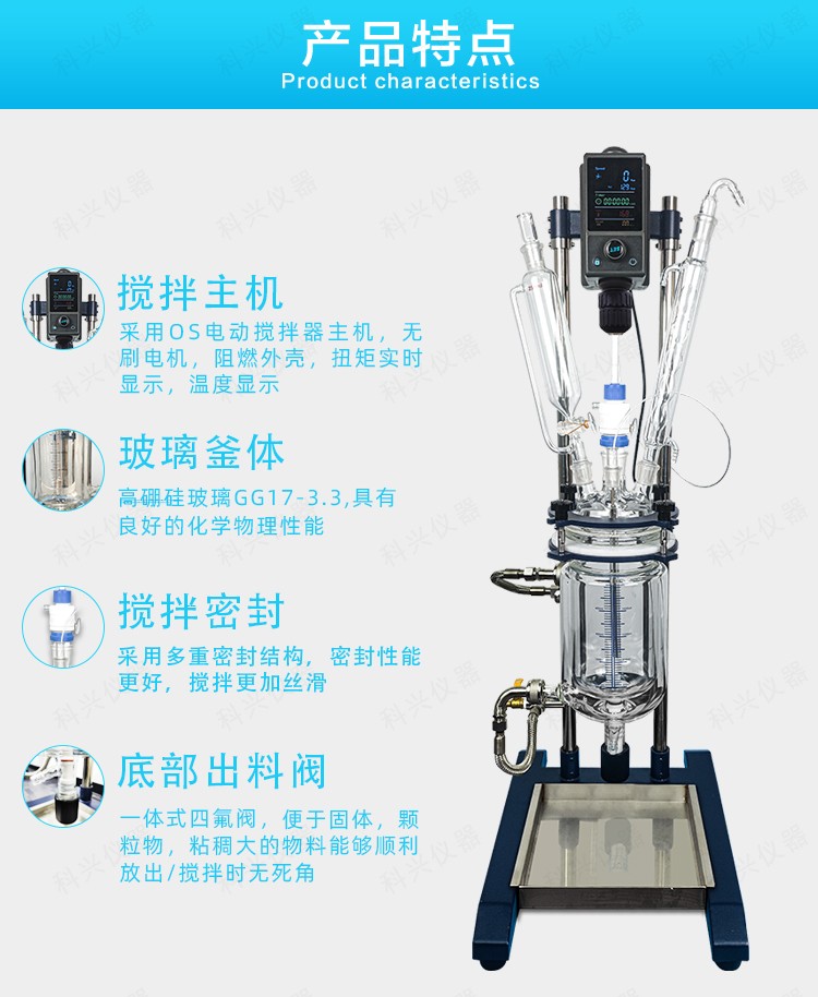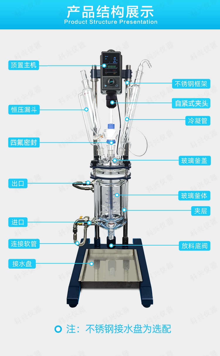 雙層玻璃反應(yīng)釜為雙層玻璃設(shè)計,內(nèi)層放入反應(yīng)溶媒可做攪拌反應(yīng),夾層可通上不同的冷熱源(冷凍液,熱水或熱油)做高溫反應(yīng)(配置相應(yīng)的循環(huán)油浴鍋,溫度可以達(dá)到300℃)或低溫反應(yīng)(配置相應(yīng)的低溫冷凍液循環(huán)系統(tǒng),溫度可以達(dá)到-80℃),也可選擇加熱制冷一體循環(huán)機(jī);在設(shè)定恒溫條件下,在密閉的玻璃反應(yīng)器內(nèi),可根據(jù)使用要求在常壓或負(fù)壓條件下進(jìn)行攪拌反應(yīng),并能做反應(yīng)溶液的回流與蒸餾,使用中可以抽成真空,從而做真空反應(yīng)。是現(xiàn)代精細(xì)化工、生物制藥和新材料合成的理想中試、生產(chǎn)設(shè)備。它的這種設(shè)計使試驗更加的安全,更加的方便。
